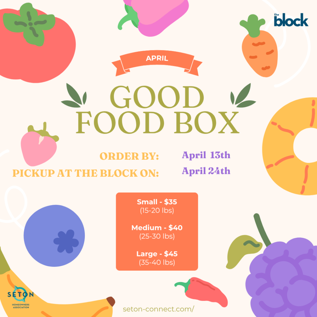 We are excited to share that the Seton Homeowners Association is now an official depot for the Good Food Box Program! This means our community can now enjoy fresh, affordable fruits and vegetables—delivered right here to the Block.